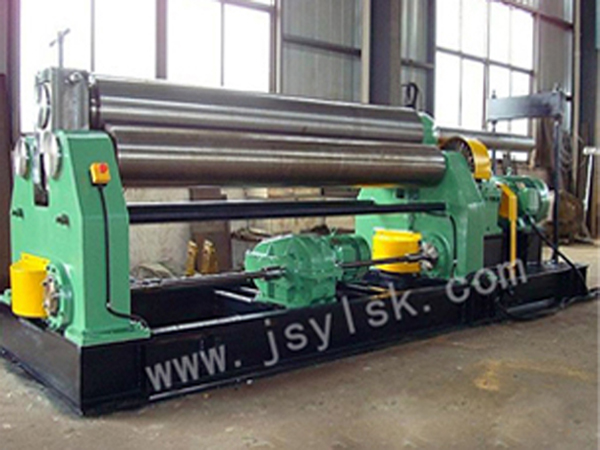 該機結構型式為三輥對稱式,上輥在兩下輥中央對稱位置作垂直升降運動,通過絲桿絲母蝸桿傳動而獲得,兩下輥作旋轉運動,通過減速機的輸出齒輪與下輥齒輪嚙合,為卷制板材提供扭矩。